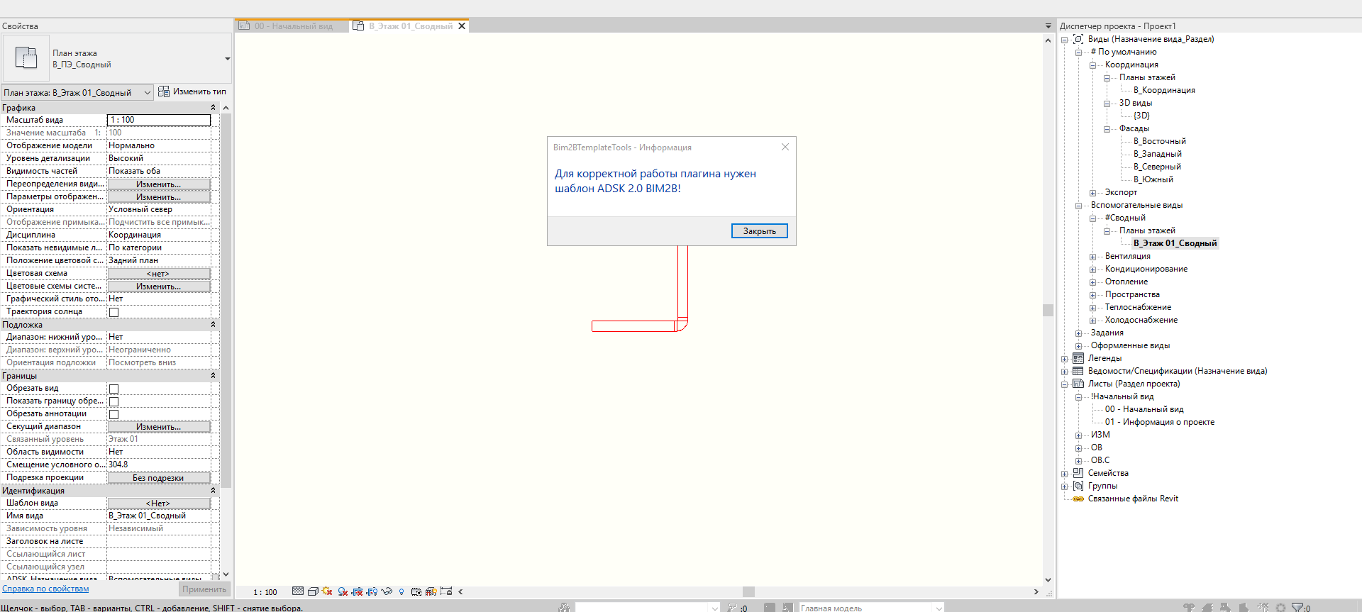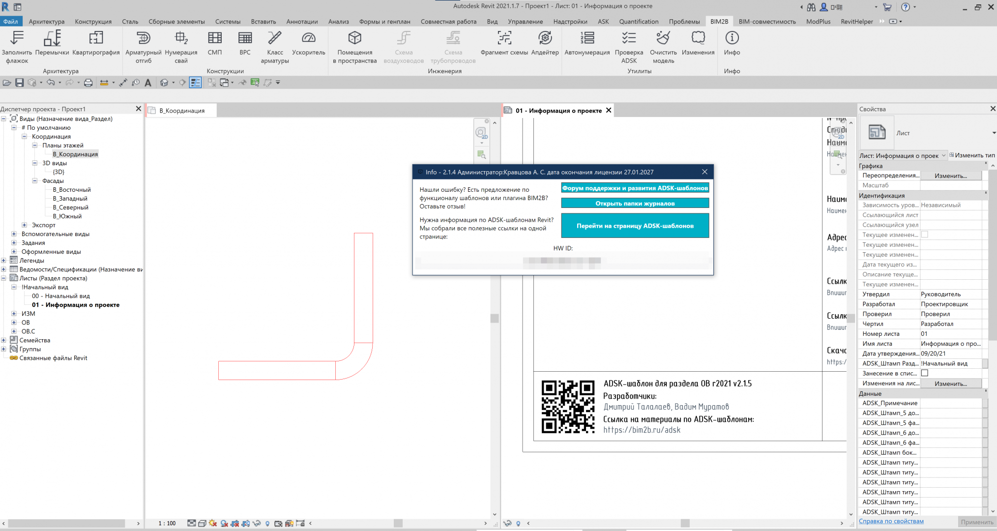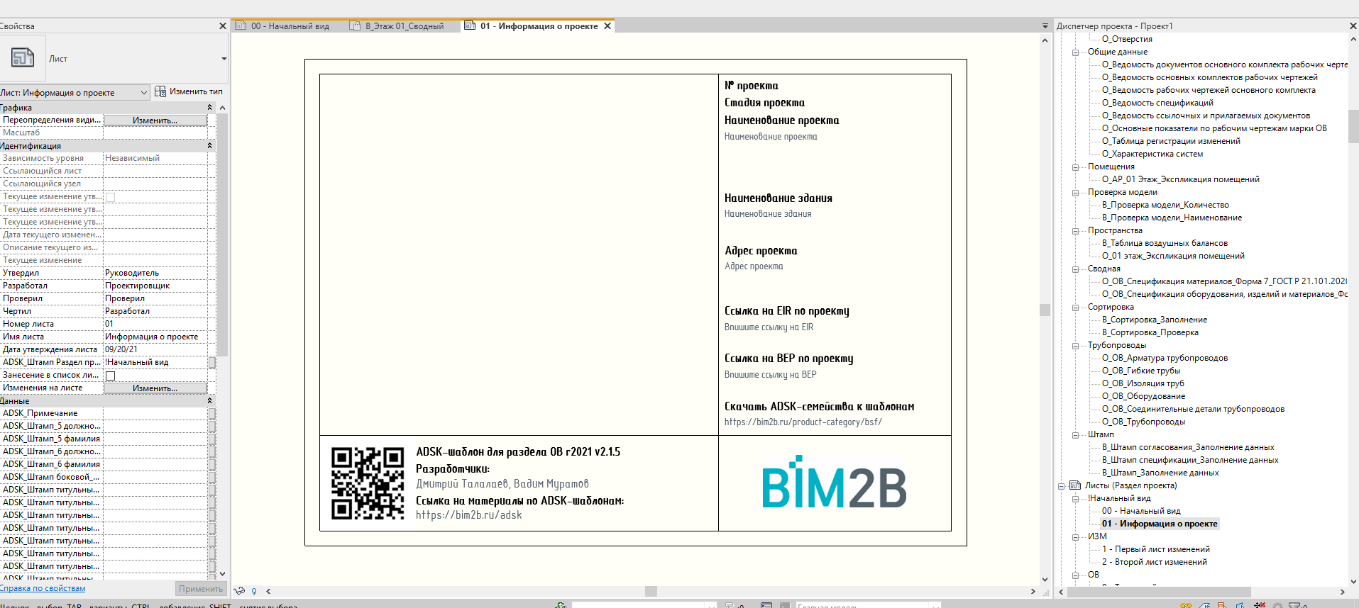 Создала проект на шаблоне ADSK_RU_Шаблон_ОВ_BIM2B_r2021_v2.1.5.rte